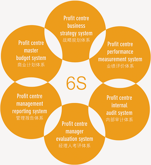 6S是戰略規劃體系、業績評價體系、內部審計體系、經理人考評體系、管理報告體系和商業計劃體系等6個System的簡稱,是華潤從自身特點出發探索的多元化控股企業管理模式,是華潤的核心管理體系。6S使華潤集團多元化企業管理模式更科學有序,整體管理架構變得更加扁平,管理層可以及時、準確地獲取管理信息,有力地促進了總部戰略管理能力的提升和戰略導向型組織的形成。