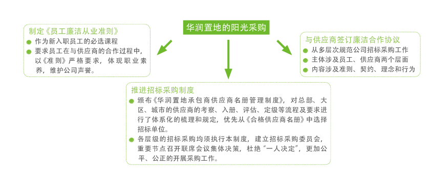 華潤集團多年來廣泛開展“陽光宣言”活動,明確要求下屬各單位在與第三方開展經濟合作時簽定廉潔協議書,并向華潤所有的供應商、合作伙伴聲明不得通過不正當的手段與華潤的企業開展合作。在采購產品和服務等過程中,嚴格遵循公開透明原則,規范招標、陽光采購,集團在官網開設了“商務服務-陽光采購”平臺,華潤電力、華潤煤業、華潤置地、華潤紡織等設置了供應商門戶和集采平臺,非涉密信息及整個過程在公眾監督之下;同時,華潤電力、華潤置地、華潤水泥、華潤燃氣、華潤壓縮機等企業通過修訂集中采購目錄、推行采購崗位輪換制度、增加采購合同中誠信條款、設立監督舉報郵箱和電話等措施,有效杜絕行賄受賄。